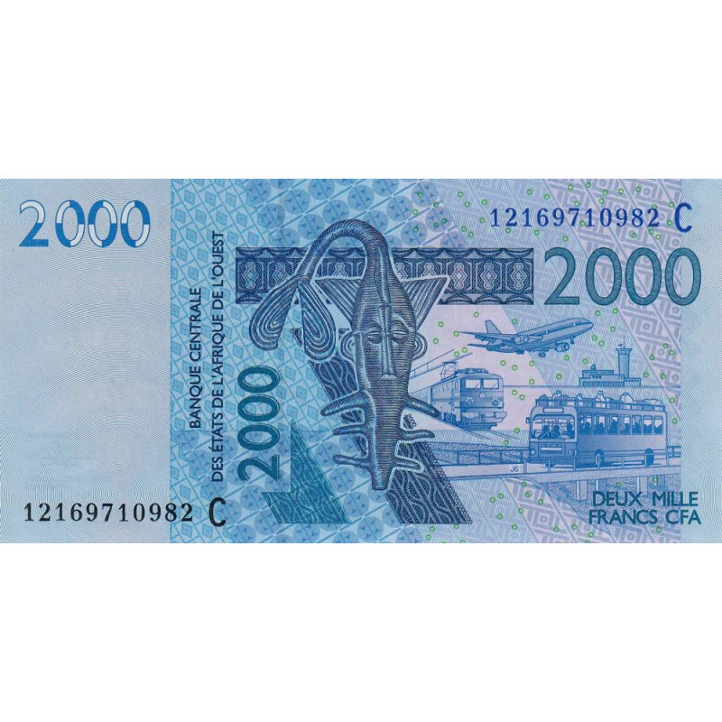 Avers : Logo de la BCEAO (poisson-scie stylisé), transport (train, avion, car)