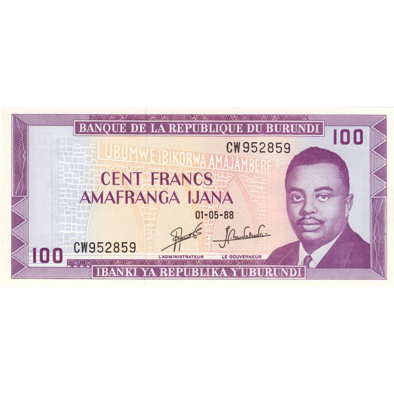 Avers : Portrait du prince Louis Rwagasore (1932-1961), mausolée du prince Rwagasore à Bujumbura en arrière-plan
