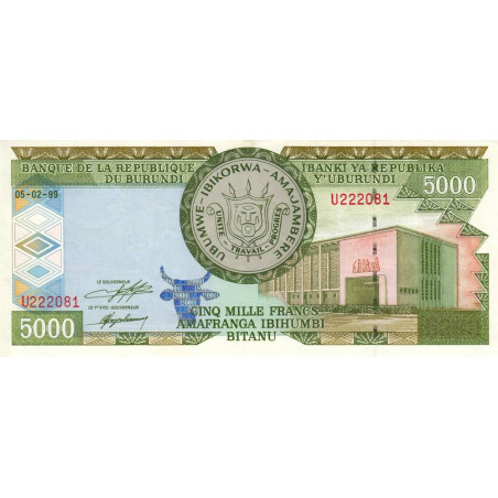 Avers : Bâtiment du Parlement de Bujumbura, armoiries du pays