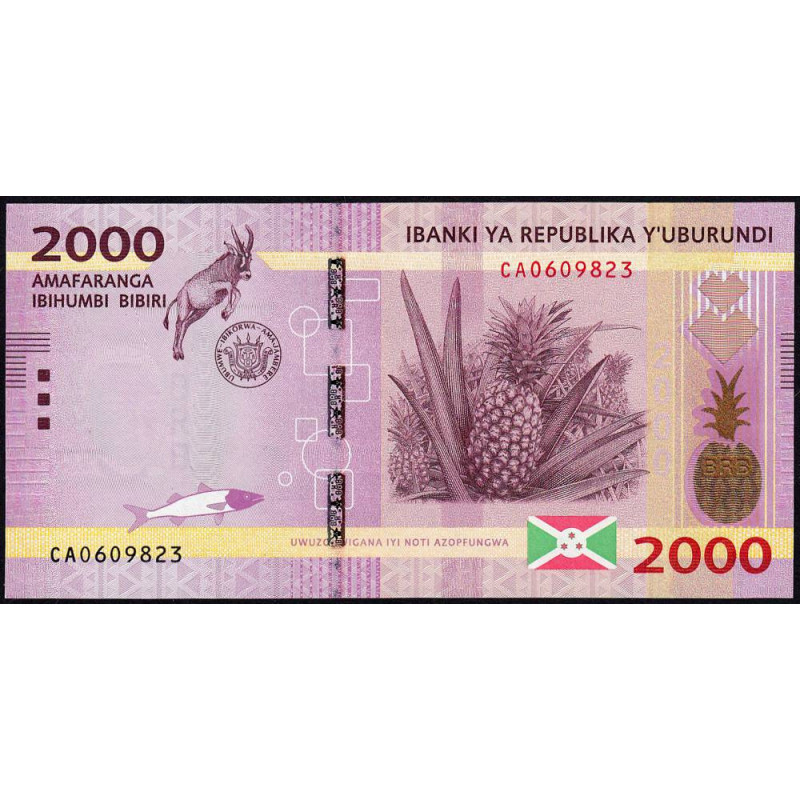Revers : Contour de la carte du Burundi, ouvrier agricole dans un champ à l'intérieur du contour, poisson