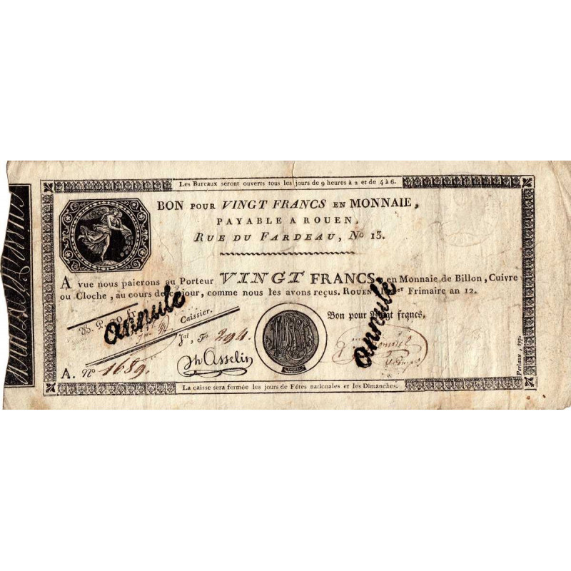 • Rouen - Caisse d'échange - Pick S 245b - 20 francs - Série A - An 12 - Etat : TB à TB+