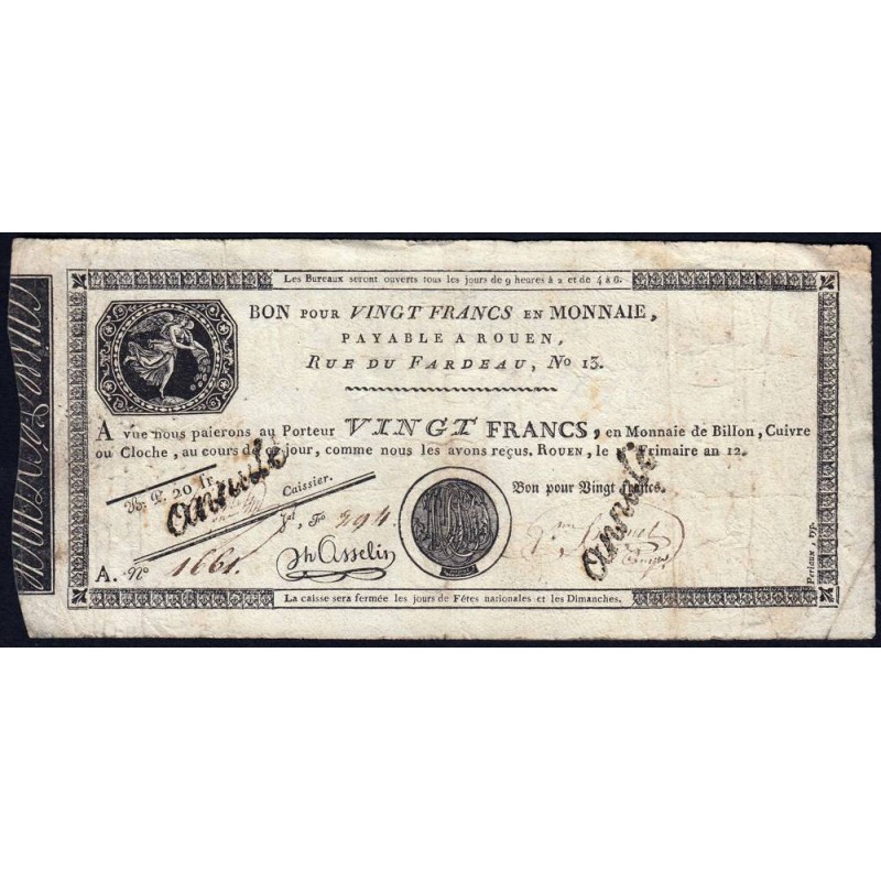• Rouen - Caisse d'échange - Pick S 245b - 20 francs - Série A - An 12 - Etat : TB à TB+