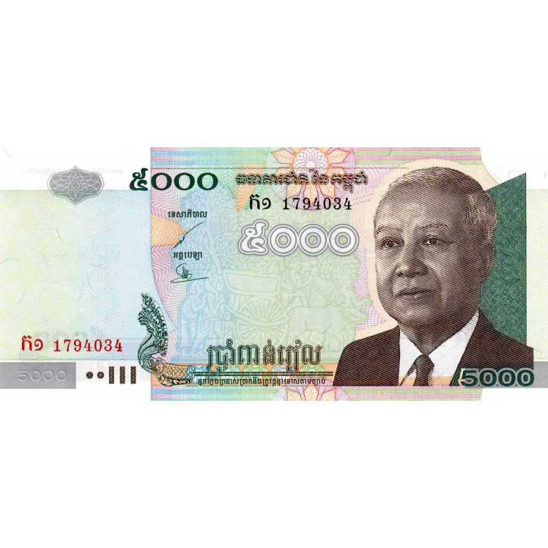 Avers : Portrait de Norodom Sihanouk (1922-2012) roi du Cambodge de 1993 à 2004, serpent mythologique à 5 têtes (nâga d'Angkor)