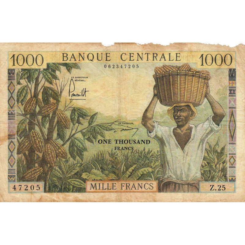 Avers : Cacaoyer, ouvrier agricole portant un panier rempli de cabosses de cacao