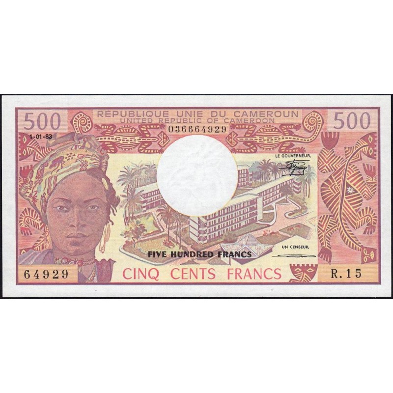 Avers : Portrait d'une femme Peulh coiffée d'un foulard, bâtiments de l'université de Yaoundé