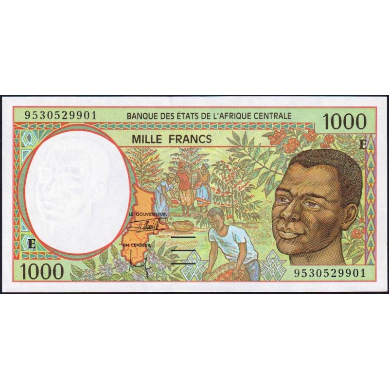 Avers : Carte de l'Afrique centrale, trois femmes et un homme récoltant des baies de café, portrait d'un homme