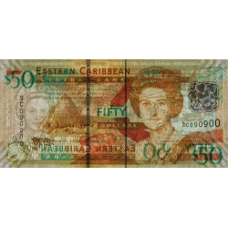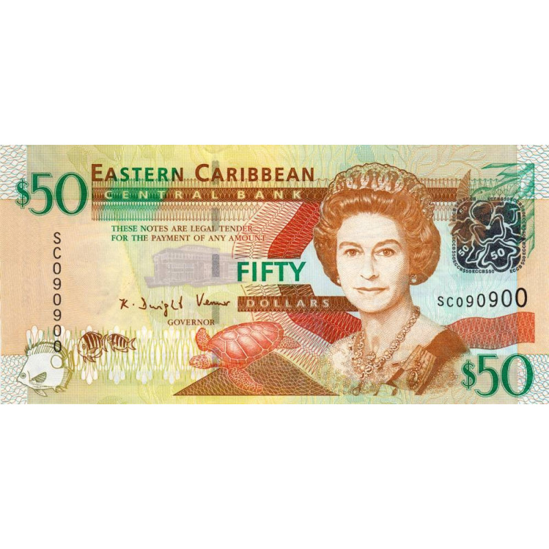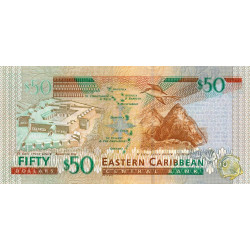 Revers : Forteresse de Brimstone Hill à Saint Kitts, carte des îles caribéennes, les pitons volcaniques de Sainte-Lucie, oiseau sterne fuligineuse, poissons