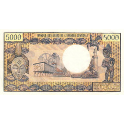 Revers : Masque en bois sculpté, mécanismes, hôtel de ville de Libreville au Gabon, gare de Pointe Noire au Congo, grumes, mosquée d'Abéché au Tchad, statue en bois sculpté