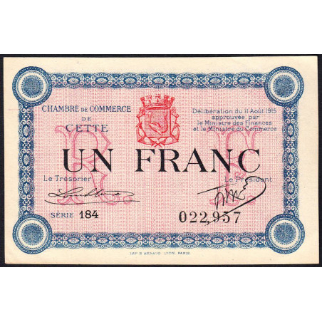 • Cette (Sète) - Pirot 41-14 - 1 franc - Série 184 - 11/08/1915 - Etat : SPL