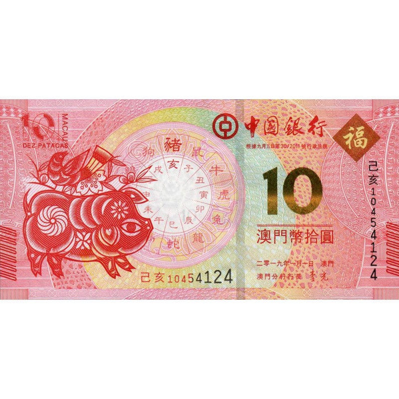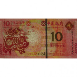 Revers : Bâtiment du siège de la Banque de Chine à Macao, enfants et feux d'artifice à l'extérieur du temple de la déesse de la mer A-Ma, année du cochon