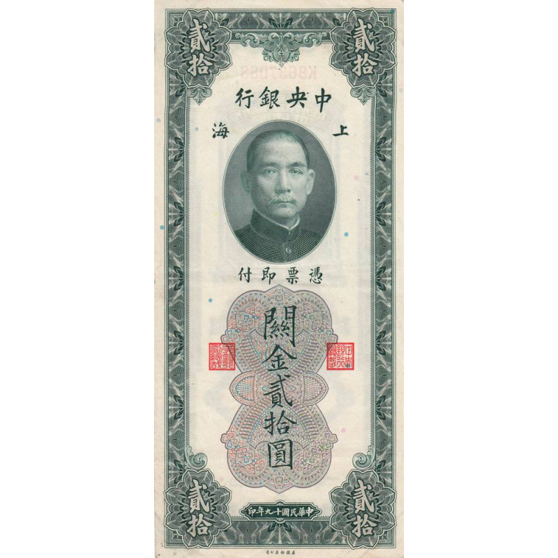 • Chine - Cent. B. of China - Shanghai - Pick 328_2 - 20 customs gold units - Série KB - 1930 - Etat : TTB