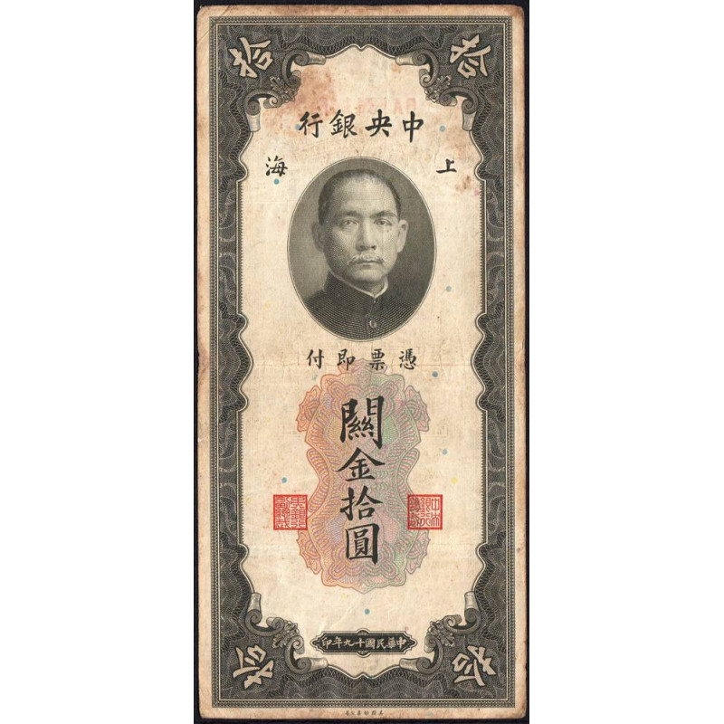 • Chine - Cent. B. of China - Shanghai - Pick 327d_2 - 10 customs gold units - Série BA - 1930 - Etat : B