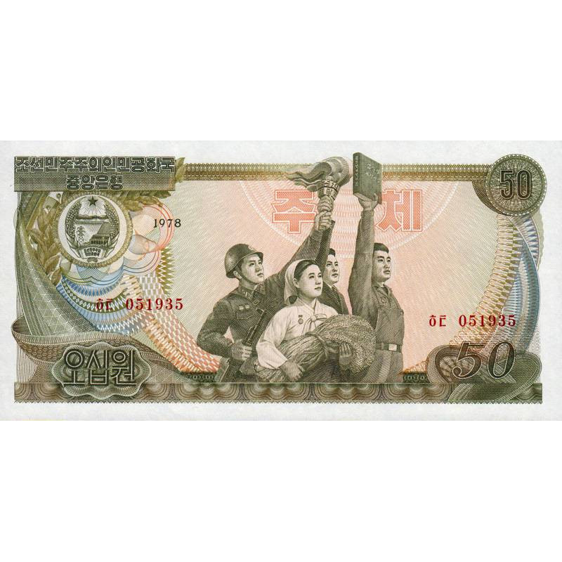 Avers : Emblème du pays, soldat et civil tenant une torche, paysanne tenant des gerbes de riz, ouvrier tenant le livre de Kim Il-Sung en l'air