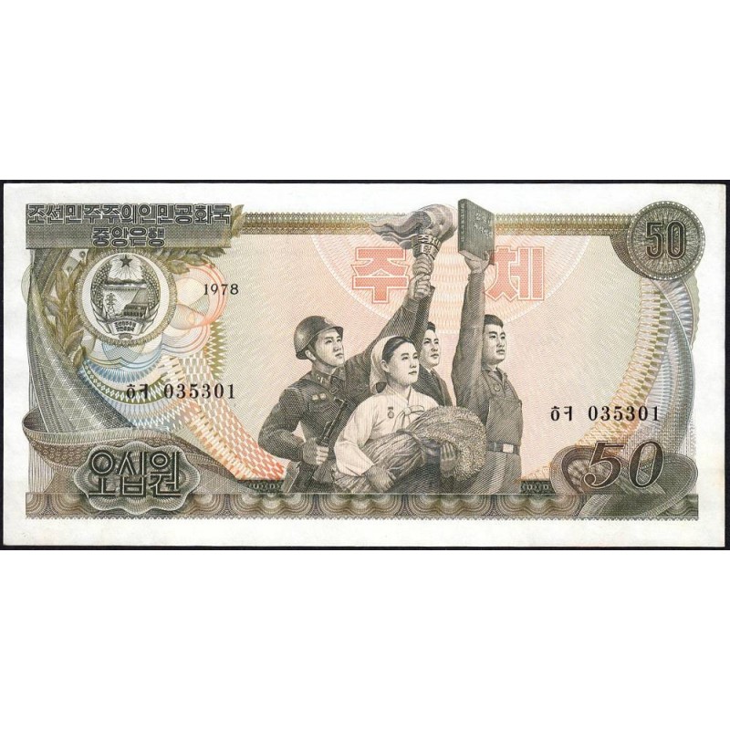 Avers : Emblème du pays, soldat et civil tenant une torche, paysanne tenant des gerbes de riz, ouvrier tenant le livre de Kim Il-Sung en l'air