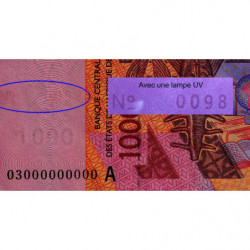 Epreuve fautée d'un billet spécimen : On aperçoit très faiblement la trace du numéro 0098 utilisé pour les SPECIMEN (problème d'encrage - voir la photo à la lampe U.V.)