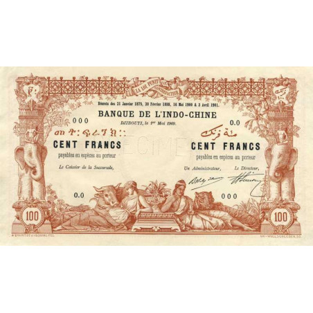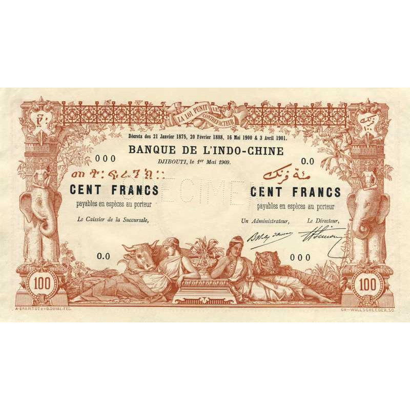 Revers : Article 139 du code pénal à l'intérieur des cadres carrés, lignes de texte BANQUE DE L'INDO-CHINE répétées en continu à l'intérieur des cadres rectangulaires