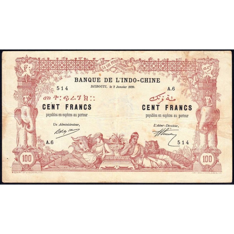 Revers : Article 139 du code pénal à l'intérieur des cadres carrés, lignes de texte BANQUE DE L'INDO-CHINE répétées en continu à l'intérieur des cadres rectangulaires