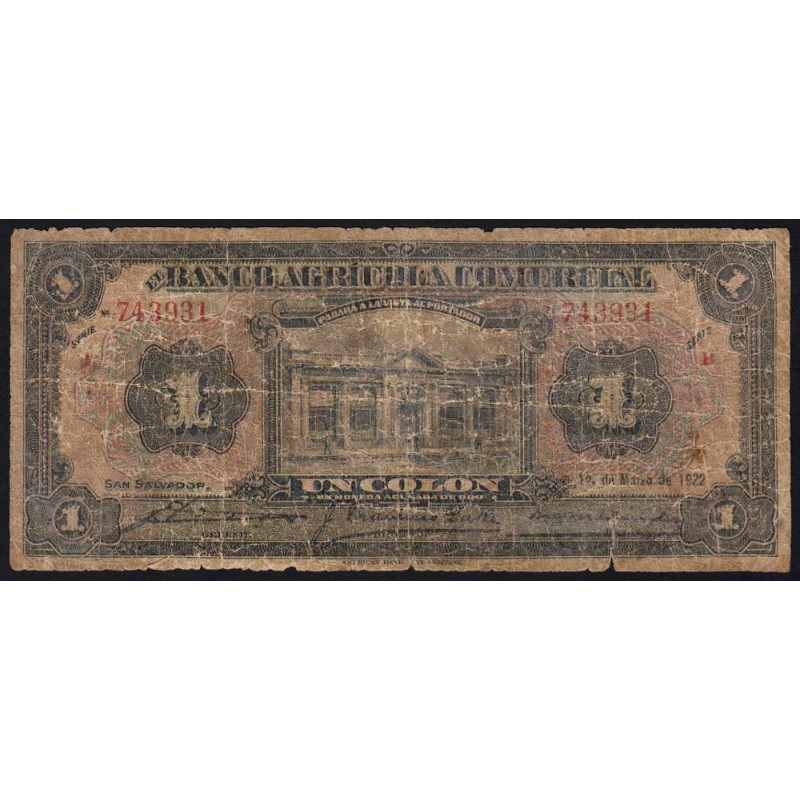 El Salvador - Pick S 108 - 1 colon - Série B - 01/03/1922 - Etat : B-