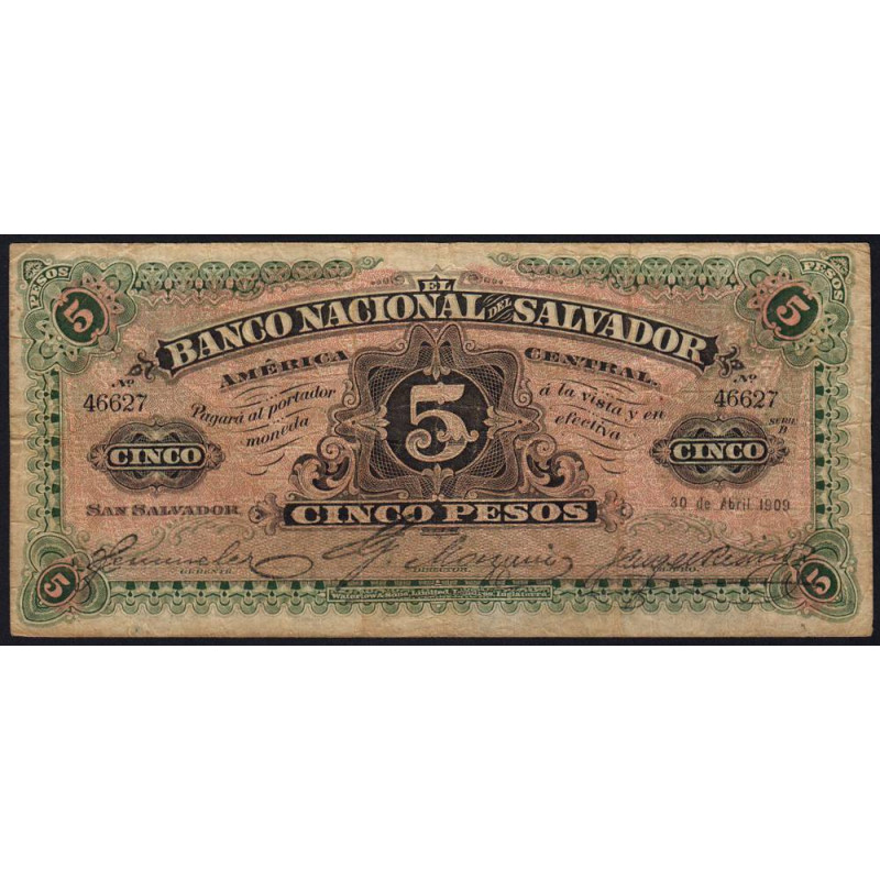 El Salvador - Pick S 162c - 5 pesos - Série B - 30/04/1909 - Etat : TB-