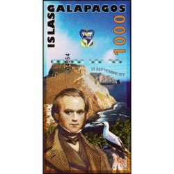 Revers : Portrait du naturaliste Charles Robert Darwin (1809-1882), en arrière-plan une photo des falaises des Galapagos avec un oiseau fou masqué perché sur un rocher, blason des îles Galapagos