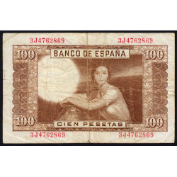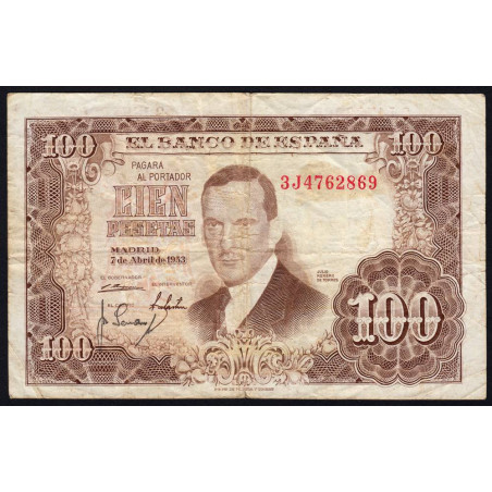 Espagne - Pick 145 - 100 pesetas - 07/04/1953 - Série 3J - Etat : TB-