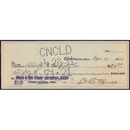 Etats Unis - Chèque - First & Tri State National Bank - 1931 - Etat : SUP