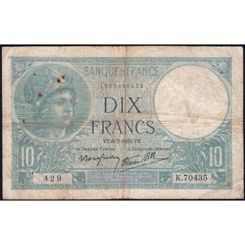 F 07-04 - 06/07/1939 - 10 francs - Minerve modifié - Série K.70435 - Etat : TB-