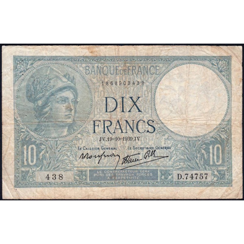 F 07-12 - 19/10/1939 - 10 francs - Minerve modifié - Série D.74757 - Etat : TB-