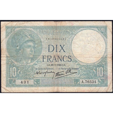 F 07-15 - 26/09/1940 - 10 francs - Minerve modifié - Série A.76534 - Etat : TB-