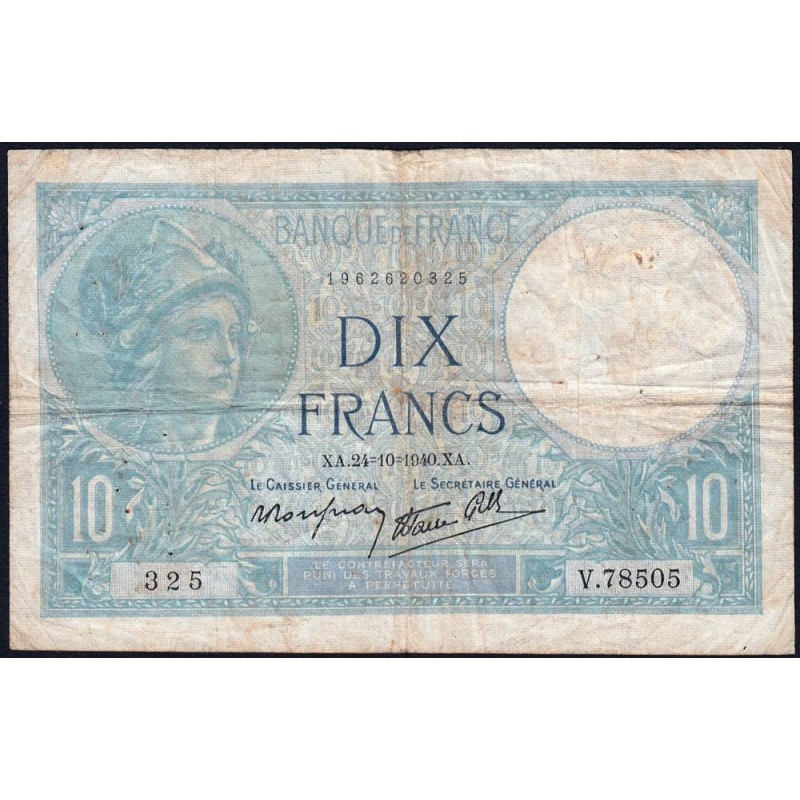 F 07-18 - 24/10/1940 - 10 francs - Minerve modifié - Série V.78505 - Etat : TB-