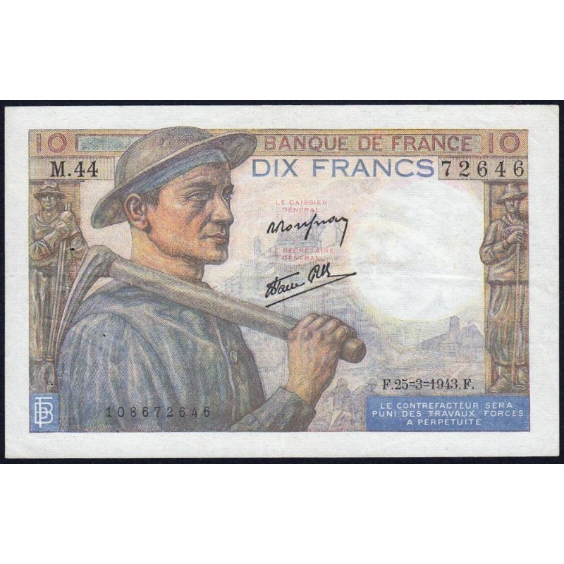 F 08-08 - 25/03/1943 - 10 francs - Mineur - Série M.44 - Etat : TTB+