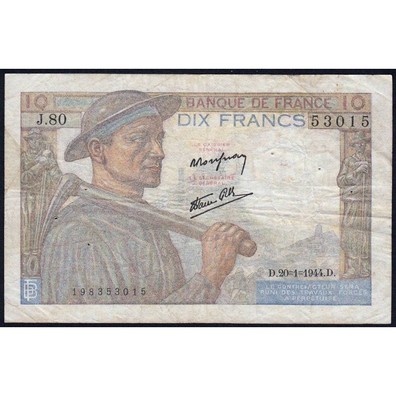 F 08-11 - 20/01/1944 - 10 francs - Mineur - Série J.80 - Etat : TB