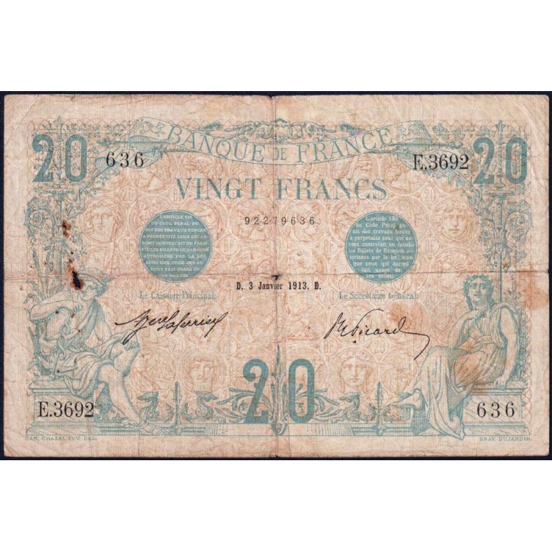 F 10-03 - 09/01/2013 - 20 francs - Bleu - Série F.3692 - Etat : B+