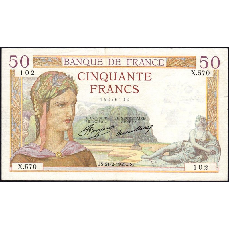 • F 17-04 - 21/02/1935 - 50 francs - Cérès - Série X.570 - Etat : TTB+