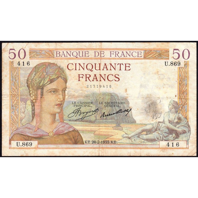 F 17-05 - 28/02/1935 - 50 francs - Cérès - Série U.869 - Etat : TB-