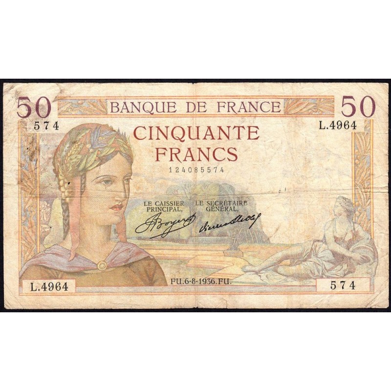 F 17-29 - 06/08/1936 - 50 francs - Cérès - Série L.4964 - Etat : TB-