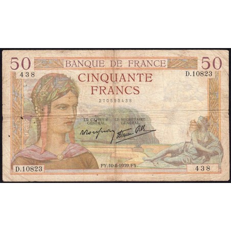 • F 18-29 - 10/08/1939 - 50 francs - Cérès modifié - Série D.10823 - Etat : TB-