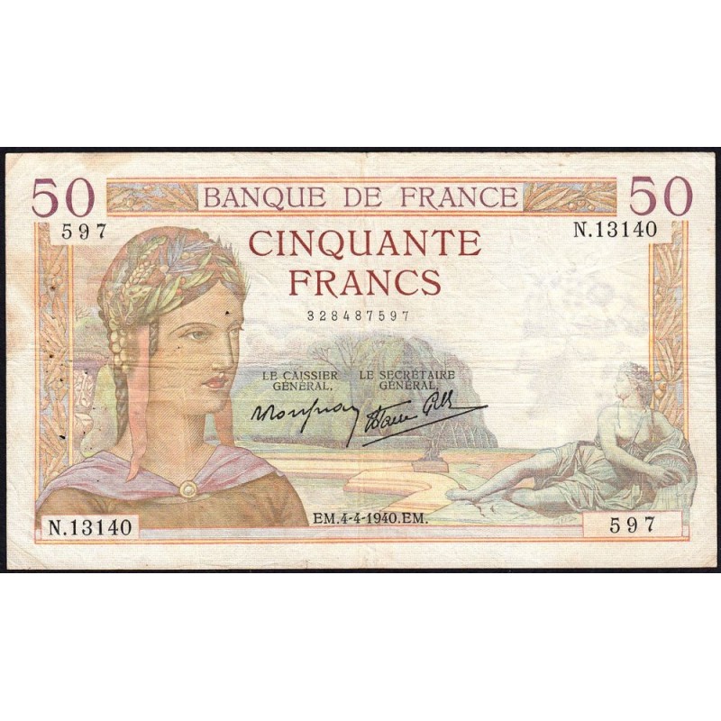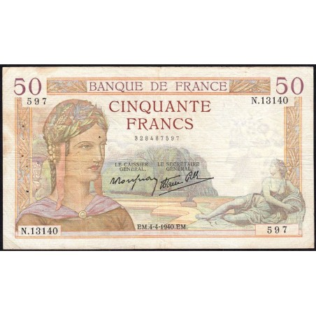 F 18-42 - 04/04/1940 - 50 francs - Cérès modifié - Série N.13140 - Etat : TB+