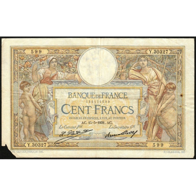 • F 24-10 - 15/05/1931 - 100 francs - Merson grands cartouches - Série Y.30327 - Etat : B