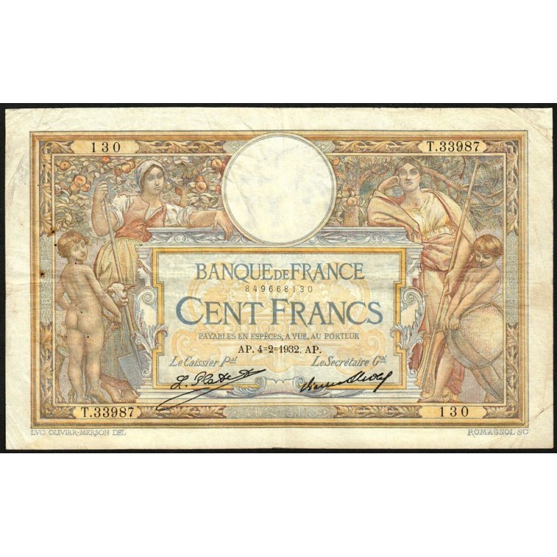 F 24-11 - 04/02/1932 - 100 francs - Merson grands cartouches - Série T.33987 - Etat : TB
