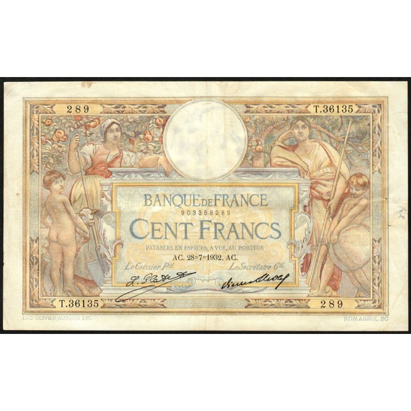 F 24-11 - 28/07/1932 - 100 francs - Merson grands cartouches - Série T.36135 - Etat : TTB-