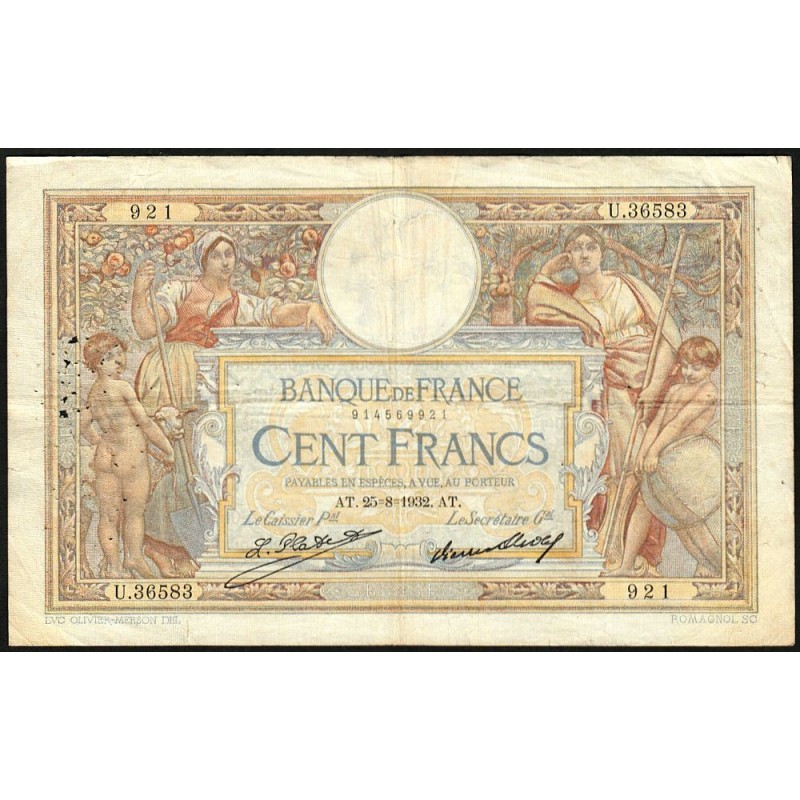 F 24-11 - 25/08/1932 - 100 francs - Merson grands cartouches - Série U.36583 - Etat : TB