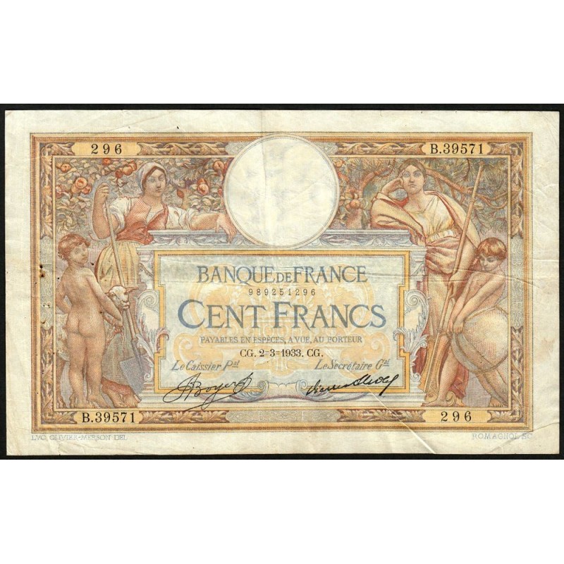 F 24-12 - 02/03/1933 - 100 francs - Merson grands cartouches - Série B.39571 - Etat : TB+