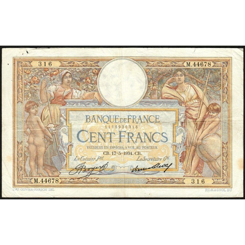 F 24-13 - 17/05/1934 - 100 francs - Merson grands cartouches - Série M.44678 - Etat : TB+
