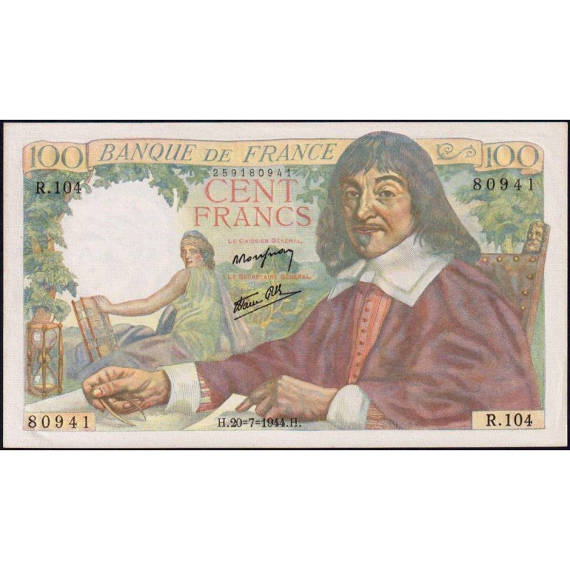 F 27-06 - 20/07/1944 - 100 francs - Descartes - Série R.104 - Etat : SPL+