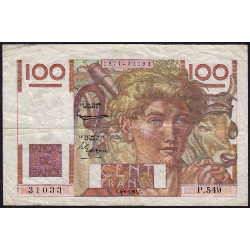 F 28-37 - 04/06/1953 - 100 francs - Jeune Paysan - Série P.549 - Etat : TB+