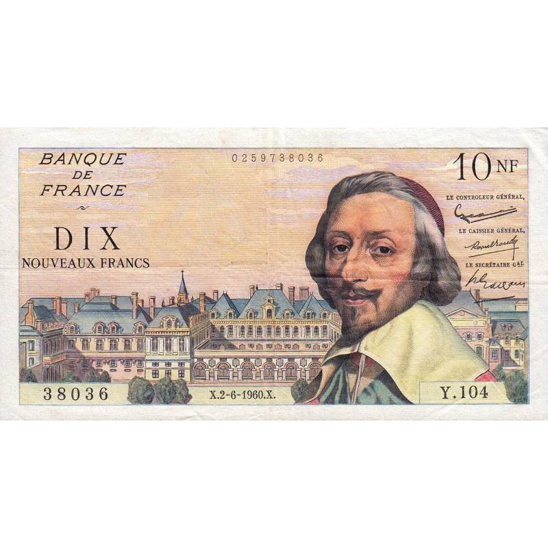 F 57-08 - 02/06/1960 - 10 nouv. francs - Richelieu - Série Y.104 - Etat : TTB à TTB+
