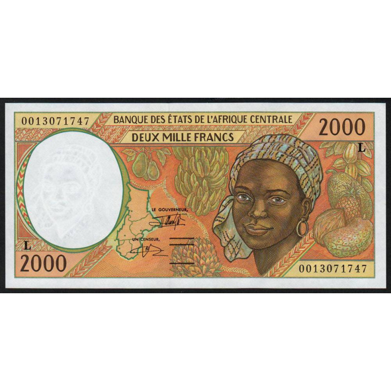 Avers : Carte de l'Afrique centrale, fruits divers, portrait d'une jeune femme portant un foulard