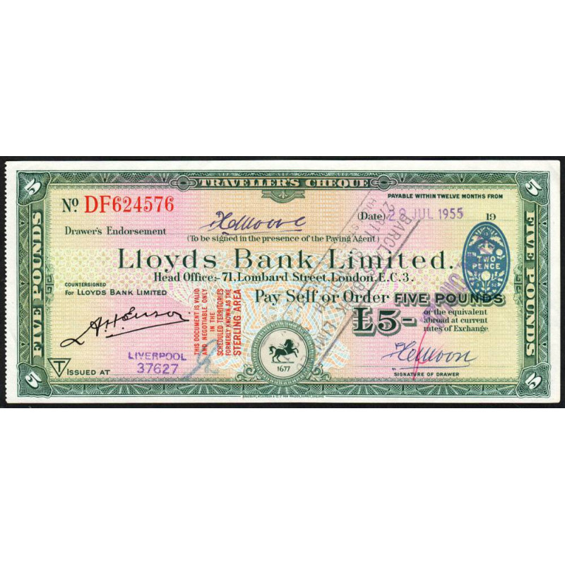 Grande-Bretagne - Chèque Voyage - Lloyds - 5 pounds - 1955 - Etat : SPL