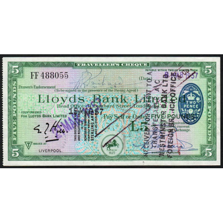 Grande-Bretagne - Chèque Voyage - Lloyds - 5 pounds - 1957 - Etat : SUP+